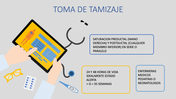 - El tamizaje se realiza mediante oximetría de pulso, preductal y postductal en recién nacidos 35 semanas con el recién nacido tranquilo, despierto.