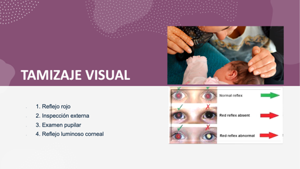 - Tamizaje visual básico (Reflejos: corneal, pupilar, rojo).